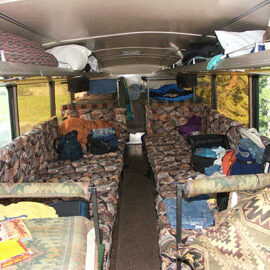The interior of our buses are extremely unconventional – In a good way! With the seats removed, our buses have been converted into lounge areas complete with pillows, a stereo system and an ice chest for beverages. As night falls and we return from another exciting day of adventure, the tables and couches convert into comfy cozy bus-beds. There you can do a little light reading from our bus-library, play some cards with your friends while listening to groovy bus tunes on the bus-wide sound system or drift off to sleep while we cruise on down the road. By morning, our drivers will have delivered us to the next wonderful place to explore, wherever it may be!